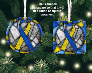 Blue and Yellow Awareness Ribbon Stained Glass Christmas Ornament, Down Syndrome