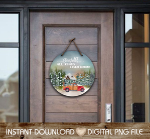 At Christmas All Roads Lead Home with Christmas Tree on Car 18" Round Door Hanger