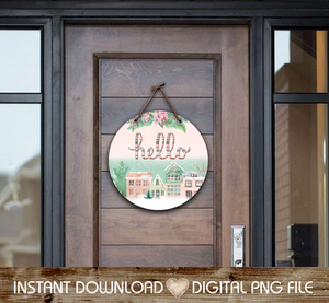 Hello from Pastel Pink Green Christmas Village 18" Round Door Hanger