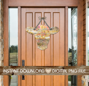 Teal wood and rustic flowers 6 inch wide Cow door hanger design file